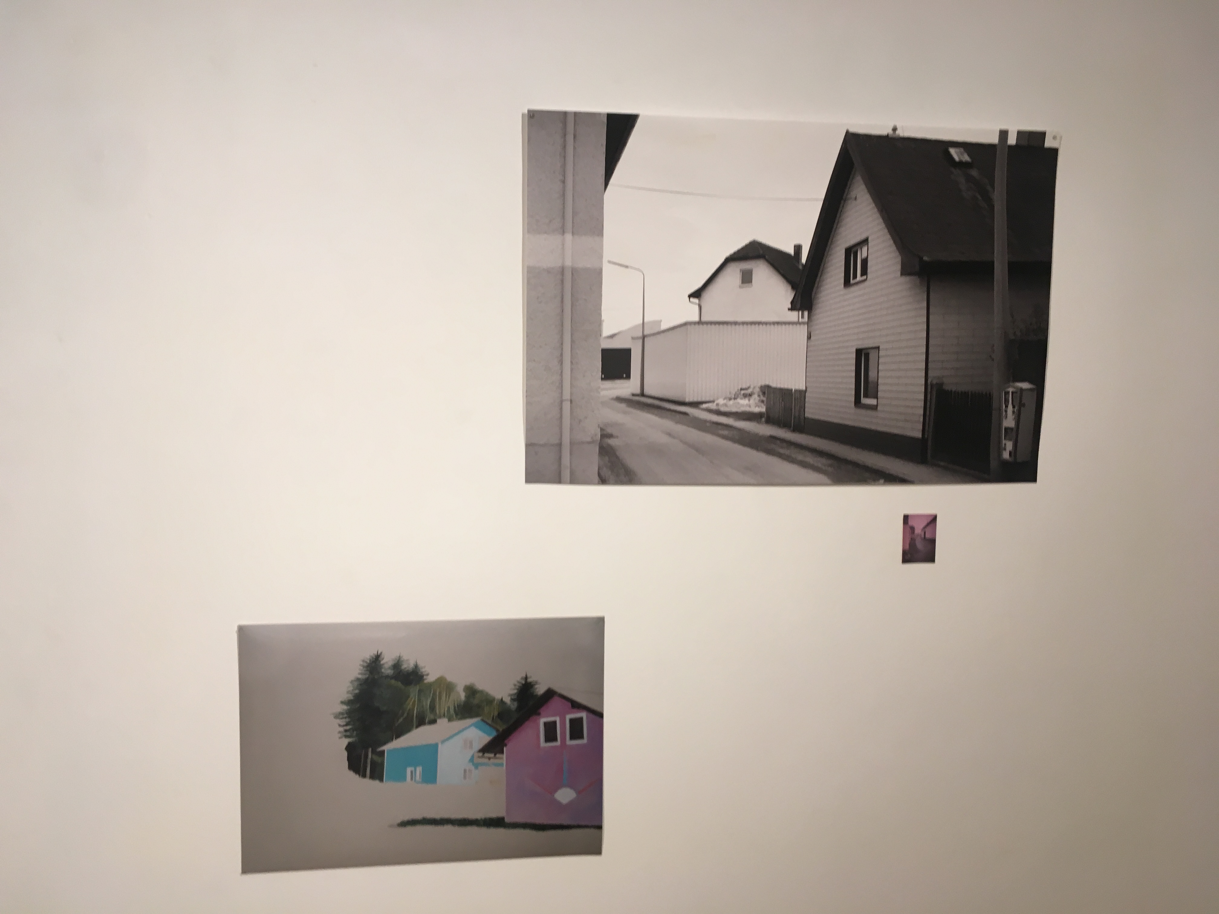 Am Anfang dieser Ausstellung ist eine Fotografie von Reinhard Winkler in schwarz weiß zu sehen, sie zeigt Häuser im Vorort, Häuser aus den 60er oder 70er Jahren, Häuser, deren Heimeligkeit sich darin begründet, dass sie eine gemeinsame Erinnerung an Unheimeligkeit auslösen. Und daneben ein Bild von Isa Riedl, das ohne vom anderen zu wissen eine Verbindung herstellt zu Winklers Fotografie: Im Hintergrund und wie von einem weißen Schleier verhüllt – einem Fehler auf dem Film, der auf die Leinwand übertragen wird – zeigt sie eine Regenrinne, Straßenlaternen und Dachansätze, ein weiteres Bild von Isa Riedl zeigt zwei Vorstadthäuser, die wiederum in ihrem Verhältnis zueinander und in ihrer Unspektakularität Winklers Fotografie ähnlich zu sein scheinen.